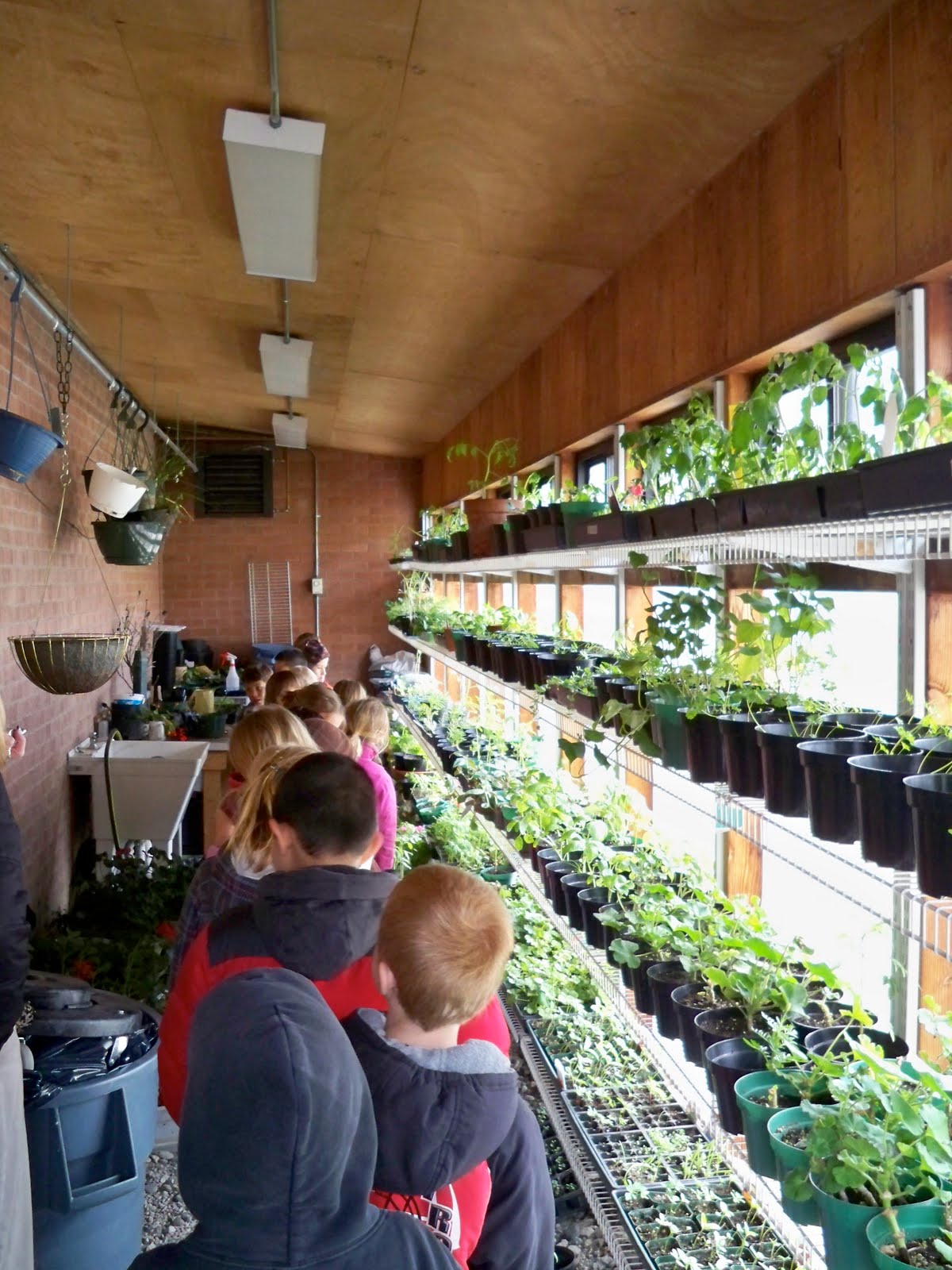 We left the newly-seeded trays in the K-8 greenhouse. In May the seedlings will be planted on the farm.