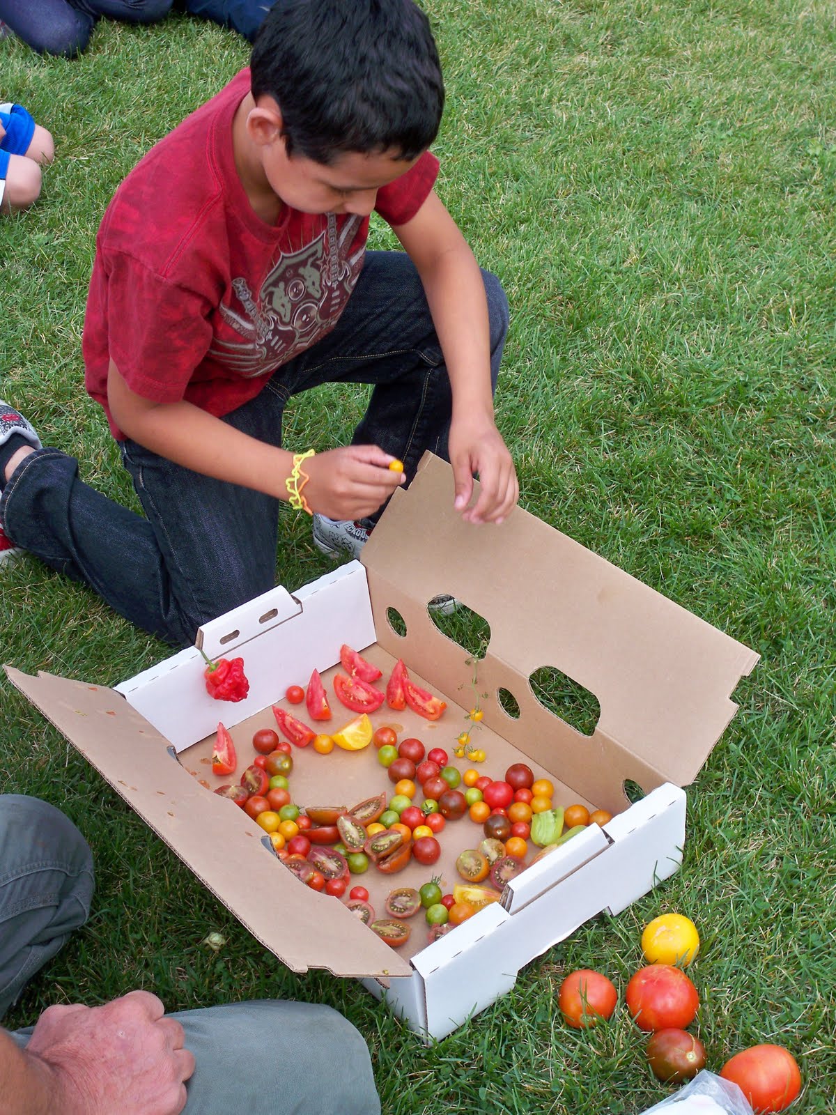 The 2nd graders enjoyed a colorful treat on the lawn (It’s been a fabulous Indian Summer in western Colorado). The students were encouraged to observe the differences between the tomatoes that came right off of the farm, and the ones that they see in the store. They noticed, size, shape, color, and aroma. One tomato was the size and color of a small pumpkin, and it was suggested that we carve it. We did, and enjoyed every bite!