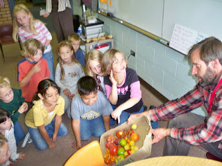last week mark and i visited the 2nd graders at the K-8 in hotchkiss. we brought just a small sample of the tomatoes that they planted last spring as 1st graders. over the course of a year the students were able to take part in the cycle of the season and planting. in the fall of 2008, the students visited thistle whistle farm and collected tomato seed (a very fun & messy process). they squished dozens of tomatoes over a gallon jar to collect all the seeds and juices they could. they took the jar back with them to their classroom and let it stand (and rot!) for about 10 days. mark & i came back to visit the class to show them how to strain, clean and dry the seed. in april of 2009 we came back to the classroom with soil, pots and couple of watering cans. the students arrived with their seed that they saved all winter long. they planted and seed and raised them for about 6 weeks in their school greenhouse. in may 2009, the class came to the farm with their seedlings ready to plant in the farm’s food bank plot. mark and several volunteers from our community tended the plants for the growing season. finally, last week we shared the harvest with the students back at school in their 2nd grade classroom. they were enthusiastic about seeing, touching and tasting the amazing variety of heirloom tomatoes that they took part in raising, full circle, last thursday.